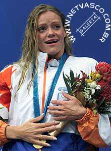 (17/09) Inge de Bruijn chora após receber medalha de ouro nos 100m borboleta.