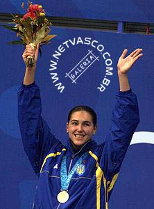 (16/09) Yana Klochkova vibra no pódio com a medalha de ouro.