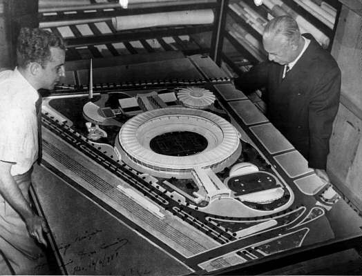 Os arquitetos Miguel Feldman e Antônio D. Carneiro diante da maquete do Maracanã, em 16/6/1949 (JPEG, 36k), foto da coleção de Branca Feldman