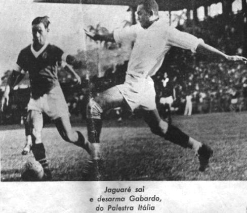 Jaguaré sai do gol e desarma adversárioO lendário goleiro em lance contra Gabardo, do Palestra Itália, em partida realizada em São Januário pelo Torneio Rio-São Paulo de 1933. |
