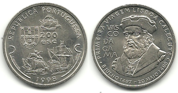 Moeda portuguesa de duzentos escudos, emitida em 1998 em comemoração do quinto