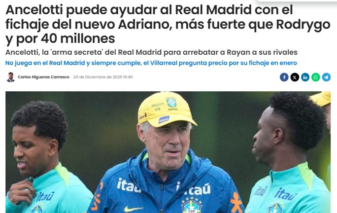 Con 20 goles en la temporada en el campeonato brasileño, Rayan es corpulento, pero también rápido, fuerte y es una de las grandes apuestas del fútbol sudamericano actual. El futbolista, que se prepara para un nuevo curso que en América comienza el próximo enero, aspira a ser convocado con la Selección brasileña, que ahora dirige Carlo Ancelotti, para disputar el Mundial de 2026, que se disputará en Estados Unidos, Méjico y Canadá. Rayan tiene mucha competencia en la delantera, pero Carletto podría ayudarle y, de paso, jugar un papel clave para intentar convencerle de un posible fichaje por el Madrid.