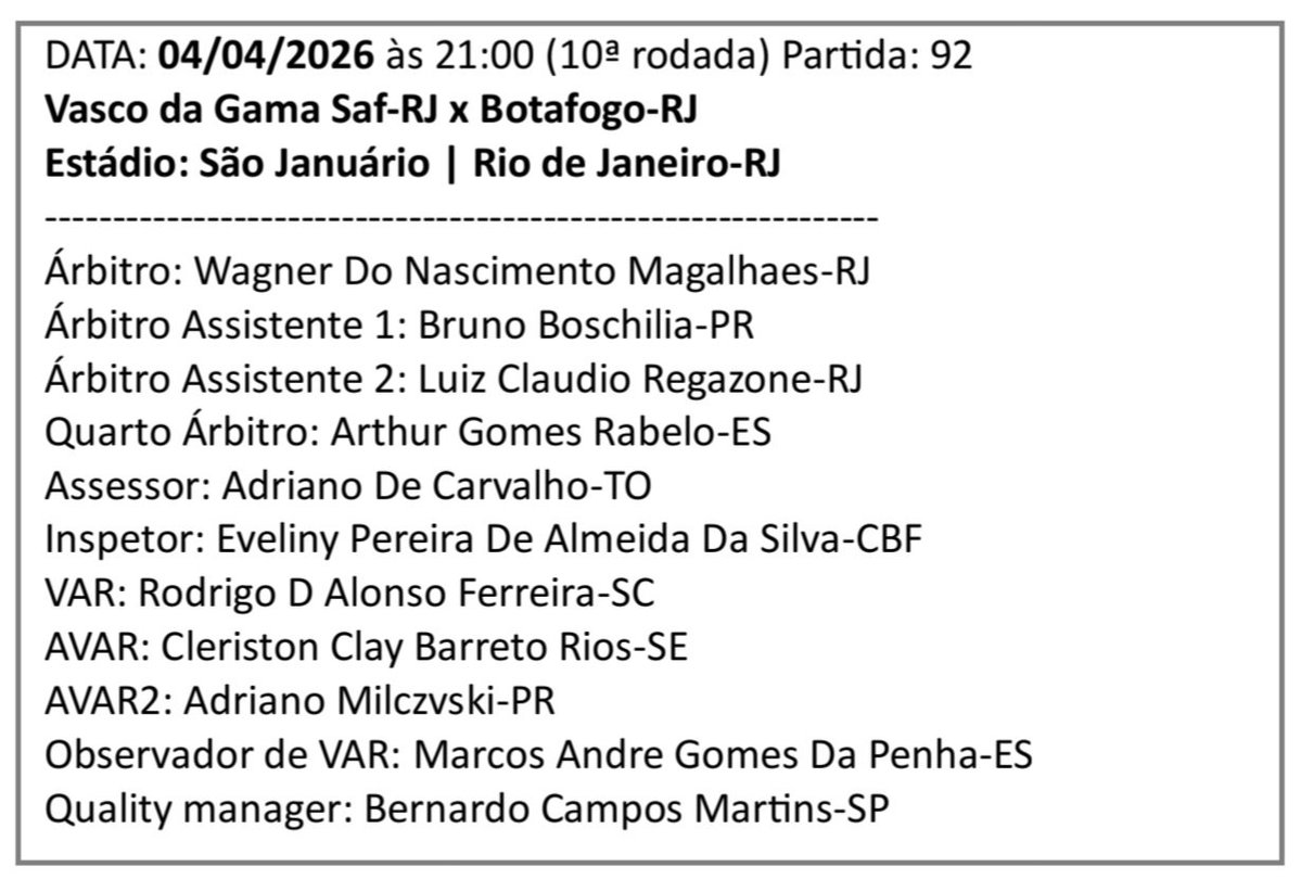 A CBF acaba de divulgar a arbitragem completa para os jogos da 10a rodada do Campeonato Brasileiro. Para a partida entre Vasco e Botafogo, sábado, em São Januário, o escolhido foi Wagner do Nascimento Magalhães (RJ). O VAR terá Rodrigo D'alonso Ferreira (SC). Confira: