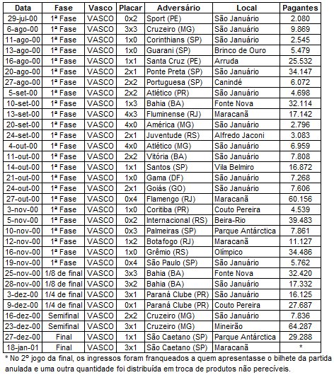 VASCO: Hélton, Clébson, Odvan, Júnior Baiano, Jorginho Paulista, Jorginho (Valkmar), Paulo Miranda, Juninho Pernambucano, Alex Oliveira (Luisinho), Pedrinho e Viola. T: Oswaldo de Oliveira.