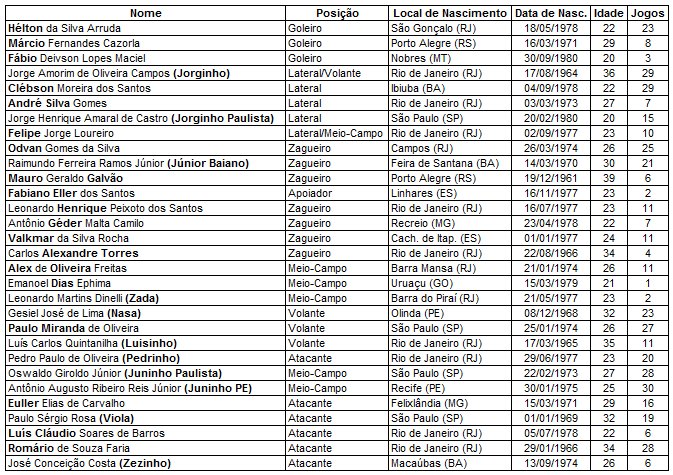 VASCO: Hélton, Clébson, Odvan, Mauro Galvão, Jorginho Paulista, Jorginho (Luisinho), Paulo Miranda (Nasa), Juninho Pernambucano (Pedrinho), Juninho Paulista, Euller e Romário. T: Oswaldo de Oliveira.