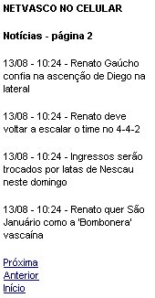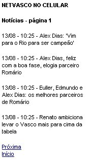 | NETVASCO - 13/08 - 23:40 - NOVIDADE NA NETVASCO: NOTÍCIAS NO SEU CELULAR! A NETVASCO inova mais uma vez! Agora o visitante pode acessar as últimas notícias da NETVASCO pelo celular! Se seu celular tem tecnologia WAP (Wireless Application Protocol), você pode ver as manchetes das últimas notícias e ficar sabendo de tudo que acontece com o Clube mesmo sem ter um computador por perto. Mas atenção para as tarifas de sua operadora de telefonia celular! As operadoras cobram por volume de dados ou por tempo de uso. Verifique quanto custa antes de acessar. A NETVASCO não se responsabiliza pelos gastos ocorridos com a visita às suas páginas Wap. O endereço WAP da NETVASCO é: http://wap.netvasco.com.br/ CONFIRA O CONTEÚDO QUE VOCÊ PODE ACESSAR PELO CELULAR: Você terá acesso às manchetes das 16 últimas notícias da NETVASCO navegando por 4 páginas, após a página inicial. Essa página inicial, aos poucos, vai ganhar outras seções do site. ![]() ![]() ![]() MAIS INFORMAÇÕES A Internet no bolso (artigo em português) Fonte: NETVASCO (texto), Folha on line (artigo) |