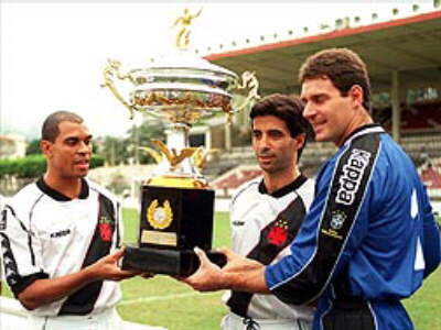 A campanha memorável começou a todo vapor, com vitórias sobre Bangu (1 a 0) e Americano (5 a 0) em São Januário e Fluminense (4 a 3) no Maracanã. Após um tropeço contra o Botafogo (2 a 1), justificado pelo cansaço do time, que se dividia entre o Campeonato Estadual e a Taça Libertadores da América, vieram duas vitórias fora de casa sobre Friburguense (3 a 0) e Madureira (4 a 0) que deixaram o Vasco com a vantagem do empate contra o Flamengo, na última rodada, para ganhar o primeiro turno. E não deu outra: com o 0 a 0 no placar, a Taça Guanabara foi parar em São Januário. O Vasco iniciou o segundo turno de maneira tão avassaladora quanto o primeiro, com vitórias sobre Americano (1 a 0) em Campos e Friburguense (3 a 1) e Madureira (2 a 0) em casa. Vendo que a Taça Rio (e conseqüentemente a do Estadual) também iria parar em São Januário, os rivais começaram a boicotar a competição. Primeiro foi o Botafogo, que não compareceu a campo para enfrentar o Vasco, configurando o primeiro WO da história do Maracanã. Depois, Flamengo e Fluminense recusaram-se a se enfrentar, o que resultou num também inédito "WO duplo". Com a inesperada ajuda dos rivais, ficou ainda mais fácil para o Vasco ser campeão: bastava uma vitória simples contra o Bangu, em Moça Bonita, na noite do dia 14 de maio. O placar mostrava 0 a 0 até os 44 minutos do segundo tempo, quando as luzes do estádio se apagaram. Após meia hora de paralisação, os refletores foram novamente acesos e o árbitro Ubiraci Damásio avisou que daria mais três minutos de jogo. A menos de 30 segundos para o fim, Juninho Pernambucano descobriu Mauro Galvão dentro da área e o capitão vascaíno só teve o trabalho de desviar a bola do goleiro Alex com um leve toque: era o gol do título. A galera vascaína explodiu em alegria, aos gritos de "É campeão" e "Urubu otário, o Vasco é campeão no centenário". A atitude antipática da diretoria do Bangu, que mandou apagar a luz do estádio durante a comemoração vascaína, não esfriou o ânimo da torcida. Da mesma forma, nem a ausência do Flamengo no clássico do domingo seguinte no Maracanã (mais um WO) nem a derrota para o Fluminense (2 a 0) uma semana depois conseguiram diminuir o brilho do título histórico do Vasco no ano de seu centenário. (Na foto: Donizete, Mauro Galvão e Carlos Germano posam com a taça de campeão estadual no gramado de São Januário.) Mais sobre o título no centenário (clique no link) Ficha do jogo histórico Campanha do Vasco Declaração do técnico Antônio Lopes logo após a conquista Fonte: NETVASCO (texto), Revista do Vasco (foto), Youtube (vídeos) |
